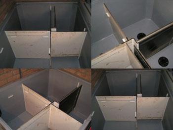 dag3: - boor behalve in de scheidingswand tussen kamer 4 en 1 in alle scheidingswanden van de kamers zo hoog mogelijk gaten van 50mm over de gehele breedte van de schotten. hier zal je water door stromen naar de volgende kamer. - zaag nog 3 halve schotten (deze zullen als "valschot dienen zodat het water in de volgende kamer ook weer omhoog stroomt) en boor in de schotten zo laag mogelijk weer gaten van 50mm over de gehele breedte - bepaal de ruimte die je als valruimte wil hebben tussen kamers. (5cm zou goed moeten zijn bij een pomp van 7000 ltr p/u) - monteer de U-profielen die de zojuist gezaagde platten gaan vasthouden. - laat de kit weer 1 dag drogen.