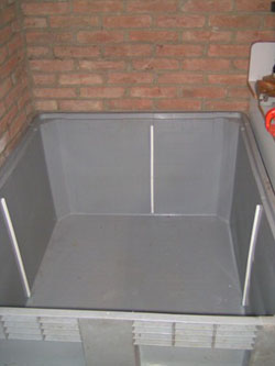 Omdat een goed groot filter erg kostbaar is hebben we besloten zelf een filter te maken. We gebruiken hier een palletbox voor. De kamers worden gemaakt door trespa schotten te maken welke in kunststof U-profielen worden geplaatst en afgekit. De eerste kamer heb ik vierkant gemaakt omdat deze als vortex gaat werken. Er word gezegd dat alleen een ronde vortex met een diameter van minimaal 60cm werkt, maar in proef opstelling werkte een kleine vierkante ook prima. Kamer twee zal met japanse matten gevuld worden. De derde kamer vullen we met bioringen of lavasteen. De laaste kamer stoppen we "vol" met zeoliet.