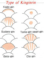 1. Niigata Ginrin In KADO-GIN heeft enkel de punt van de schub een glinstering, terwijl bij SUDARE-GIN de schittering uitstraalt over de schub. Hoe langer de uitstraling is, hoe beter. Onregelmatige plaatsing van de glinsteringen op de rand van de schub, gekend bij KASU-GIN, is in het algemeen niet zo geliefd.