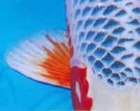 Het is ook wenselijk dat het rood op de vinnen helder is, met een vurig rode tint. Zulke vinnen worden SHUSUI-BIRE (SHUSUI-vinnen) genoemd en zowel bij de Asagi als de Shusui, die we later bekijken, worden zij hoog geprezen. In vele gevallen heeft het rood op het lager gelegen deel van het lichaam gewoonlijk een roestkleurige kleur en het spreekt voor zich dat een helder vurige rode kleur verkieslijk is.