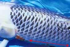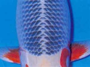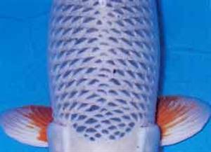 Een goede Asagi moet over een goede Fukurin (oplichtende schubrand zie rode pijl) beschikken die voor een mooi regelmatig netpatroon zorgt.