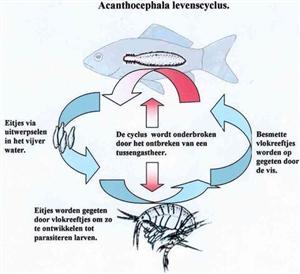 Taxering lijst van AcanthocephalaZiekteverschijnsel en diagnose[/b] Aan de buitenkant van de vis is niet te zien dat de vis geïnfecteerd is. Na opening van de buikholte echter, kunnen de beige kleurige, tot twee centimeter grote parasieten gezien worden. De vis vermageren sterk desondanks ze toch goed eten. Er kan ook kleur verlies zijn en de vissen worden trager. Foto levenscyclus De cyclus Ze hebben een levenscyclus via een of meer tussen gastheren. Acanthocephalus bevat diverse soorten, die in alle leeftijden te vinden zijn. De parasiet is op soort te brengen door het tellen van het aantal haken per rij op de proboscis (zie foto 1) , het langwerpige kopdeel die bewegelijk is. Een mond of een verteringskanaal hebben deze wormen niet. Ze absorberen de voedingsstoffen in het darmkanaal van de gastheer gewoon door de lichaamswand. Deze haakwormen planten zich geslachtelijk voort. Met name in de winter en het vroege voorjaar kunnen zware infecties met Acanthocephalus soorten worden gevonden. De volwassen worm die zich in de darmen bevindt produceert eieren, die bevrucht worden en via de mest naar buiten komen. In het eikapsel zit de acanthor-larve. De eieren worden gegeten door amfipoden of andere kreeft- achtigen. In deze verplichte tussengastheer vervellen de acanthor-larven tot cystacanth-larven. De parasietlarve wordt weer gegeten door de vis, waarin de larve tot volwassen worm uitgroeit. Er kan ook een extra tussengastheer meespelen: een prooivis. Als deze het besmette plankton eet, wordt de parasietlarve in een cyste ingebouwd in de lever. Daar ontwikkelt deze zich nog niet nader tot volwassenheid. De roofvis eet de geïnfecteerde prooivis, waarna de parasiet volwassen wordt in d darm van de roofvis.