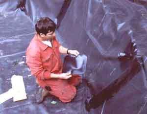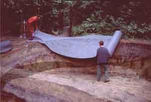 Het is nu tijd voor het aanbrengen van het beschermvlies. Dat is een weefsel uit gerecycleerde synthetische stoffen, dat tussen de rubberfolie en de volle grond van de wand en de bodem van de zwemvijver geplaatst wordt. Dit garandeert een optimale bescherming, want eenmaal gevuld met water komt de rubberfolie onder grote druk te staan. Het beschermvlies is volledig aangebracht. Pas nu worden de precieze maten genomen van de zwemvijver, en wordt er berekend hoe het rubber arbeidsvriendelijk kan geplaatst worden. In het filtergedeelte komt op de rubberfolie later nog een bijkomende beschermlaag, om te verhinderen dat later, na het vullen, scherpe lavasteentjes uit de filtermassa het rubber zouden beschadigen.Zo wordt ieder risico zorgvuldig vermeden.