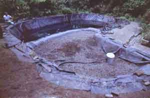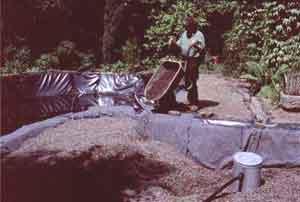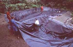 Een ideale folie voor het aanbrengen in een zwemvijver is rubberfolie. Rubberfolie is heel sterk, soepel, heeft een lange levensduur en is ook aangenaam als je huid ermee in aanraking komt. Een rubberfolie van minimum 1 mm dikte is ideaal. Belangrijk is ook dat de folie in zo breed mogelijke afmetingen leverbaar moet zijn zodat we niet hoeven te lijmen. Het afrollen van de folie moet erg zorgvuldig gebeuren. Zo vermijden wij dat er te veel plooien ontstaan Maak hier uw tijd voor, het bepaald het latere uitzicht van uw zwemvijver. Bij zwemvijvers met een 'natuurlijke' vorm ontstaan onvermijdelijk plooien na het aanbrengen van de rubberfolie. Deze worden nu dicht geplooid en er wordt een rubberstrook overheen gekleefd. Zo worden deze plooien onzichtbaar en onvoelbaar. Na deze werken mag er meteen al wat water in de zwemvijver, zodat de folie langs de randen zich kan 'zetten'. Filter. Na het aanbrengen van het extra beschermvlies over de rubberfolie van het filtergedeelte,wordt de filtermassa, bestaande uit vulkaansteentjes, uitgestort. De oppervlakte van het filtergedeelte moet bij zwemvijvers ongeveer 25% bedragen van de zwemoppervlakte en een zelfde gemiddelde diepte hebben. Door de grote interne oppervlak kan dit poreuze materiaal voldoende micro-organismen herbergen om een helder zwemwater te kunnen garanderen. Vulkaansteentjes zijn bovendien een neutraal materiaal.