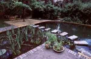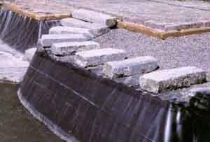 Afboording. Hiervoor kunnen we verschillende materialen aanwenden, stapstenen, hout, enz. Kies het liefst voor warme materialen. Arduinen stapstenen worden tussen het zwem- en het filtergedeelte geplaatst. De randen van de zwemvijver worden afgeboord met een ander natuurlijk materiaal: tufsteen uit Toscane. Poreus en toch hard vormt dit een ideale afboording. Deze zal later bemossen, zodat de zwemvijver nog mooier zal aansluiten bij de rest van de tuin.