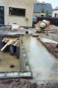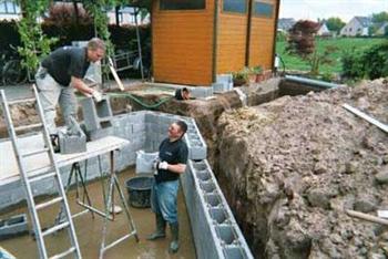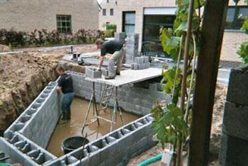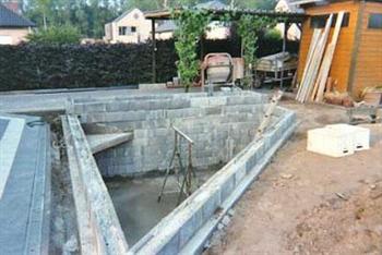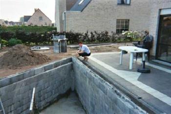 Vrijdag 21 maart werden de betonblokken geleverd. Om zeker te zijn had ik het formaat 29X39X19 gekozen. Holle blokken zonder bodem die gewoon op elkaar worden gestapeld. Om de stevigheid te garanderen word er om de twee lagen blokken betonijzer van 10mm ingelegd. Later voor het volstorten met beton werd er ook vertikaal het nodige betonijzer voorzien. Moest ik nu terug beginnen zou ik voor de lichtere versie blokken opteren. Immers de blokken van 19X39X19 zouden voor mijn formaat van vijver ook voldoen. Bovendien had ik bij deze blokken toch ook weer een 3 m³ meer aan inhoud overgehouden