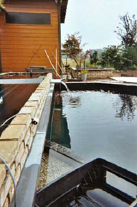 Na 20 uur vullen stopt de waterteller op 22m³ voor de vijver en 2.5m³ voor de plantenbak. Het proefdraaien kon eindelijk beginnen. De Oase skimmer deed zijn werk goed. Van hier uit word de plantenbak gevoed met een Aquamax 10.000L pomp. Ook de overloop van de plantenfilter werkte naar behoren. Dit zijn 3 RVS buizen met een diameter van 68mm die het water terug naar de vijver sturen. Later bleek er toch een lek te zijn aan de doorvoer naar de plantenbak. Niet makkelijk om zo een lek op te sporen. Het werd pas duidelijk zichtbaar na een 3 tal weken, door het ontstaan van een natte plek in de gevelsteen. Uiteindelijk werd dit opgelost door polyesterpasta aan te brengen rond de plaats waar de 50mm buis door de vijverwand gaat. Het was in deze hoek dat de polyestermatten niet perfect op elkaar aansloten en het water zich en weg zocht doorheen de wand.