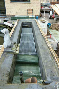 De plantenbak die als nitraat filter zijn diensten zal moeten bewijzen. Deze bak is op het diepste punt 60cm, 100cm breed en 510cm lang. Het metalen rooster dient als verhoogde bodem om het gletsjerrock en substraat te dragen. Uiteraard zijn de gegalvaniseerde roosters met poeder coating gelakt om oxidatie en het afscheiden van metalen te vermijden. De roosters zijn 10cm verhoogd op klinkers geplaatst. Hieronder word het aangevoerde water gelijkmatig verdeelt door een buizenstelsel. Dit verdeelsysteem bestaat uit 3 aan elkaar verbonden buizen met een diameter van 50mm. Om de 10cm zijn hierin gaatjes van 4mm geboord, 3 rijen per buis. Op deze manier wordt het water gelijkmatig verdeelt onder het gehele plantenfilter. Op de rooster heb ik een geperforeerde pvc mat aangebracht die moet vermijden dat de gletsjerrock de vrije ruimte onderin gaat opvullen. Tussen de grotere gletsjerrock en het fijnere substraat licht een kunststof beplantingsmat die beide materialen gescheiden moet houden. Om dit filter optimaal te laten werken zijn er ook nog 3 grote luchtstenen onder het rooster voorzien. Een Hiblow 60 zorgt voor extra beluchting van dit filtermateriaal en een betere werking van de bacteriën die zich hierop nestelen. Door middel van een schuifkraan kan ik indien nodig het water laten weglopen en de bak uitspoelen.
