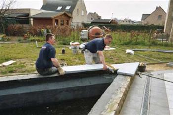 Uiteindelijk bleef nog de eindafwerking over. De boordsteen in arduin plaatsen en afwerken. Een vrij “zwaar†en secuur werkje. Om alles volledig af te dichten werd de voeg tussen wand en deksteen afgekit met Tec7.