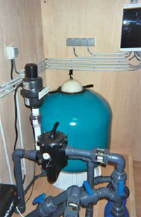 Het biologische hart van de filter is deze Ultra Bead 100. Een beetje ruim voor de vijver van 22m³ maar zo beschik ik over voldoende reserve bij een zwaardere visbezetting. Het voordeel van de beadfilter is zijn beperkte plaatsinname, ongeveer 1m² volstaat om hem op te stellen. Bovendien is ook het onderhoud zeer beperkt. In de aanloopfase (eerste 3 maand) werd hij om de 4 weken grondig gespoeld.