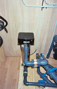 Via de UB wordt het water verder gevoerd naar de BIO-UV. Hier zorgt de krachtige UV lamp voor het afsterven van zweefalgen en een groot deel van de “zwevende†parasieten. Ook bij deze installatie dient de lamp om het jaar vervangen te worden en het kwartsglas om de 3 jaar. Na de BIO-UV gaat het water terug naar de vijver.