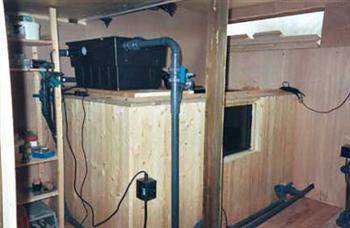 Dit is afhankelijk van de temperatuur en naargelang de vissen meer of minder voedsel krijgen. In de periode zonder grote spoelbeurt wordt het vuil dat zich onderaan op de bodem van de UB neerslaat wel 2 maal per week afgevoerd via een speciaal hiervoor voorziene aftapkraan. Door gebruik te maken van kijkglazen op de aanvoer en afvoerleidingen kan je gemakkelijk volgen en controleren of er nog vervuiling in het water aanwezig is. De pomp een ITT J50 heeft een debiet van 13.000L per uur. Ik vermoed dat ik na het verlies door wrijving nog een goede 11.000L behoud.