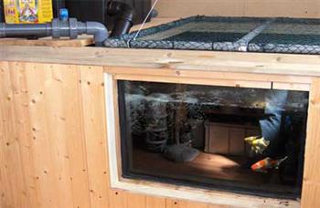 Mijn Q-bak. Verder heb ik mijn installatie vervolledigd met een Q-bak van 2.5m³. Deze doet dienst als hospitaalbak en ook voor het tijdelijk opvangen van nieuwe vissen. Hierop heb ik als filter een Oase Biotec 18 met zeef gevoed met een Aquamax 3500 pomp. Verder is er een UV lamp van 11w voorzien en een elektrische verwarming van 1kw. Om de vissen makkelijker te kunnen observeren is de Q-bak van een raam voorzien. Het net over de bak moet nieuwkomers verhinderen om uit de bak te springen. Door een aanvoerleiding vanaf de BIO-UV te voorzien kan ik indien gewenst het water van de hospitaaltank en de vijver gedoseerd met elkaar vermengen. Dit maakt het uitzetten voor de nieuwe aanwinsten door de geleidelijke gewenning aan het vijverwater beter verdraagbaar.
