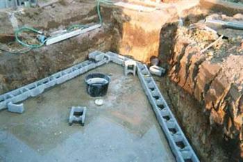 Het plateau voor de skimmer is onderschoord. Rechts naast de vijver is de bodemplaat voor de verhoogde plantenbak aangebracht en is de betonvulling in de blokken vers ingegoten. Een tweede grote constructiefout is ook hier al vrij duidelijk zichtbaar. De wand van de vijver aan de plantenbak staat een beetje naar binnen gebogen. Dit kwam door het te snel en te hoog aanvullen met grond tegen de losgestapelde betonblokken wand. Deze kon de druk van de grond niet weerstaan. Bovendien hebben we in al onze ijver ook een kleine fout gemaakt bij het uitzetten van de blokken. Na controle bleek de muur een 15cm uit de lijn te staan. Al bij al geen ramp want met het nodige “foefelwerk†werd dit volledig weggewerkt.